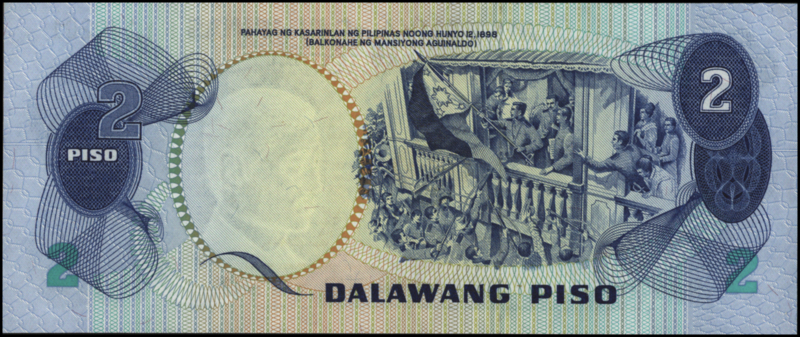 | Bijzonderheden: | Sign Marcos/Laya Blue on mc unpt. J. Rizal at l. Central bank Seal type 4. Back: Scene of Aguinaldo's independence declaration of june 12, 1898. Ovpt: ANG BAGONG LIPUNAN on wmk area. Wmk: J. Rizal. UV: legend in curve over Rizal portrait fleoresce orange. |