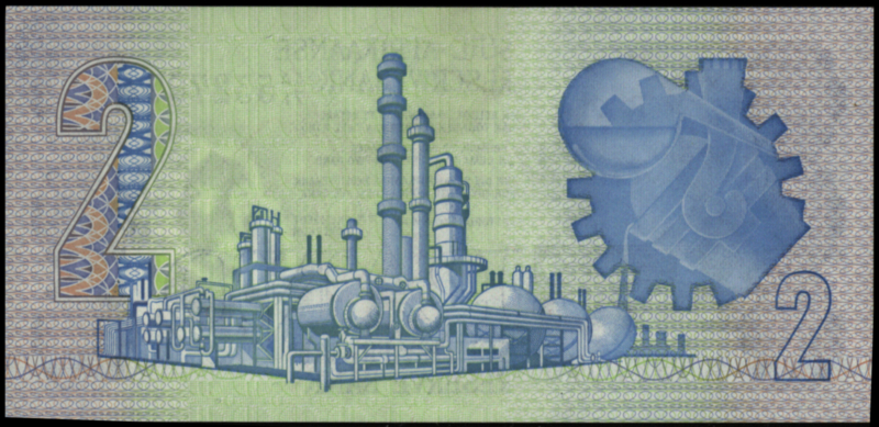 Serie: 1981. Sign De Kock. Fractional Numbering system. With Security Thread. Blue on mulitcolor underprint. Jan van Riebeeck at left, electrical tower at center. Back: Refinery at left center. Watermark: Jan van Riebeeck.