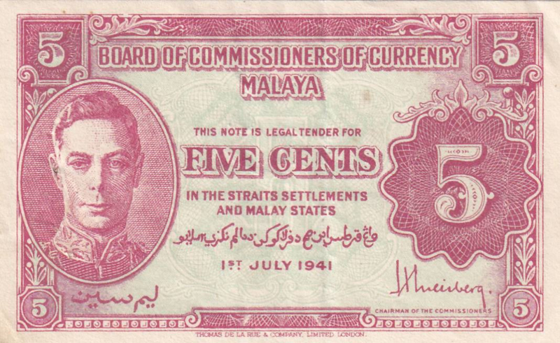 | Bijzonderheden: | Short Jawi script lower left. FIVE CENTS at eye level. Portrait: Type A.. There are pinholes. |