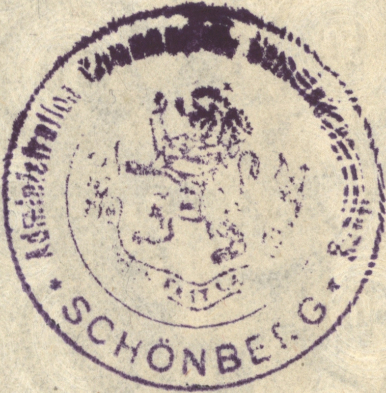 Tweetalig omschrift. Stempel administration communale / Gemeindeverwaltung•Schönberg. No unpt. Ltr.