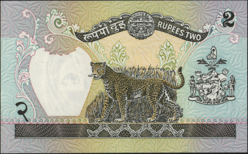 | Bijzonderheden: | Sign Adhikary. W/o line on lower lip.. Green, light blue and brown. Front: King Birendra in royal dress and plumed crown; temple of Bajrayogini at Sankhu; obverse of coin; goddess Laxmi. Back: Spotted leopard in tall grass; bank logo; coat of arms. Solid secu thread. Wmk: Plumed crown. |