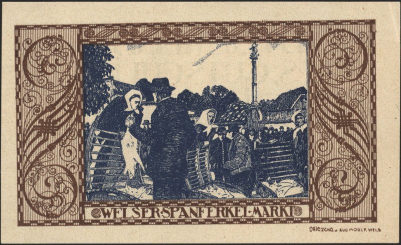| Bijzonderheden: | Stadtgemeinde Umrahmung braun, Bild blau.. Welserspanferkelmarkt |