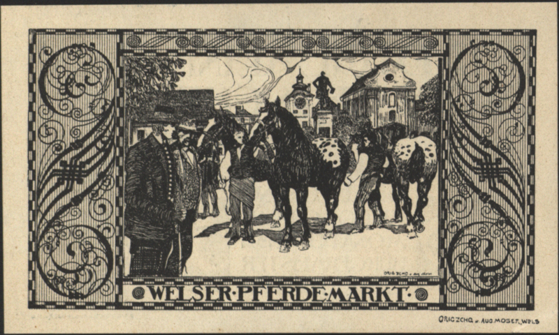 | Bijzonderheden: | Stadtgemeinde Umrahmung und bild schwarz. Welserpferdemarkt |