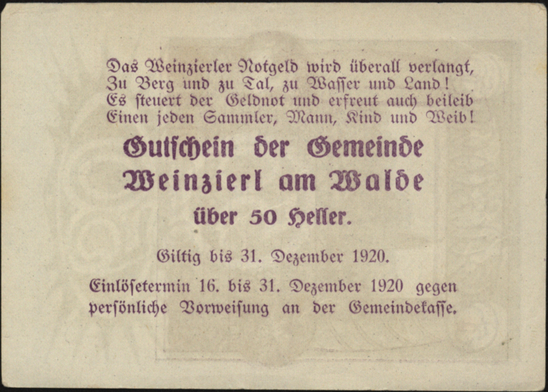 Oostenrijk - Noodgeld - Weinzierl am Walde KK. 1151 50 Heller 1920