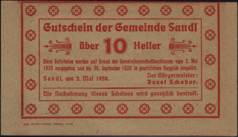 Oostenrijk - Noodgeld - Sandl KK: 874 10 Heller 1920