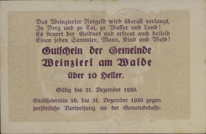 Oostenrijk - Noodgeld - Weinzierl am Walde KK.:1151 10 Heller 1920