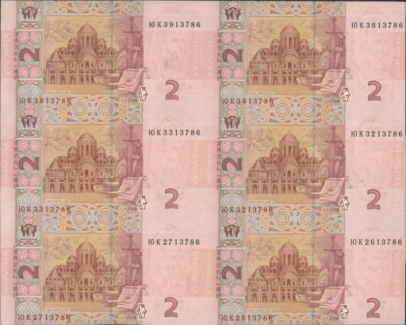 | Bijzonderheden: | 6 uncut notes in a sheet Brown. Front: Coat of arms. Prince Yaroslav I the Wise. Back: Bank logo; Saint Sophia's Cathedral in Kiev. Bowl, helmet, swords and doc. Solid secu thread with demetalized 2 ГРН and trident. Wmk: Yaroslav II and electrotype hryvnia symbol. |