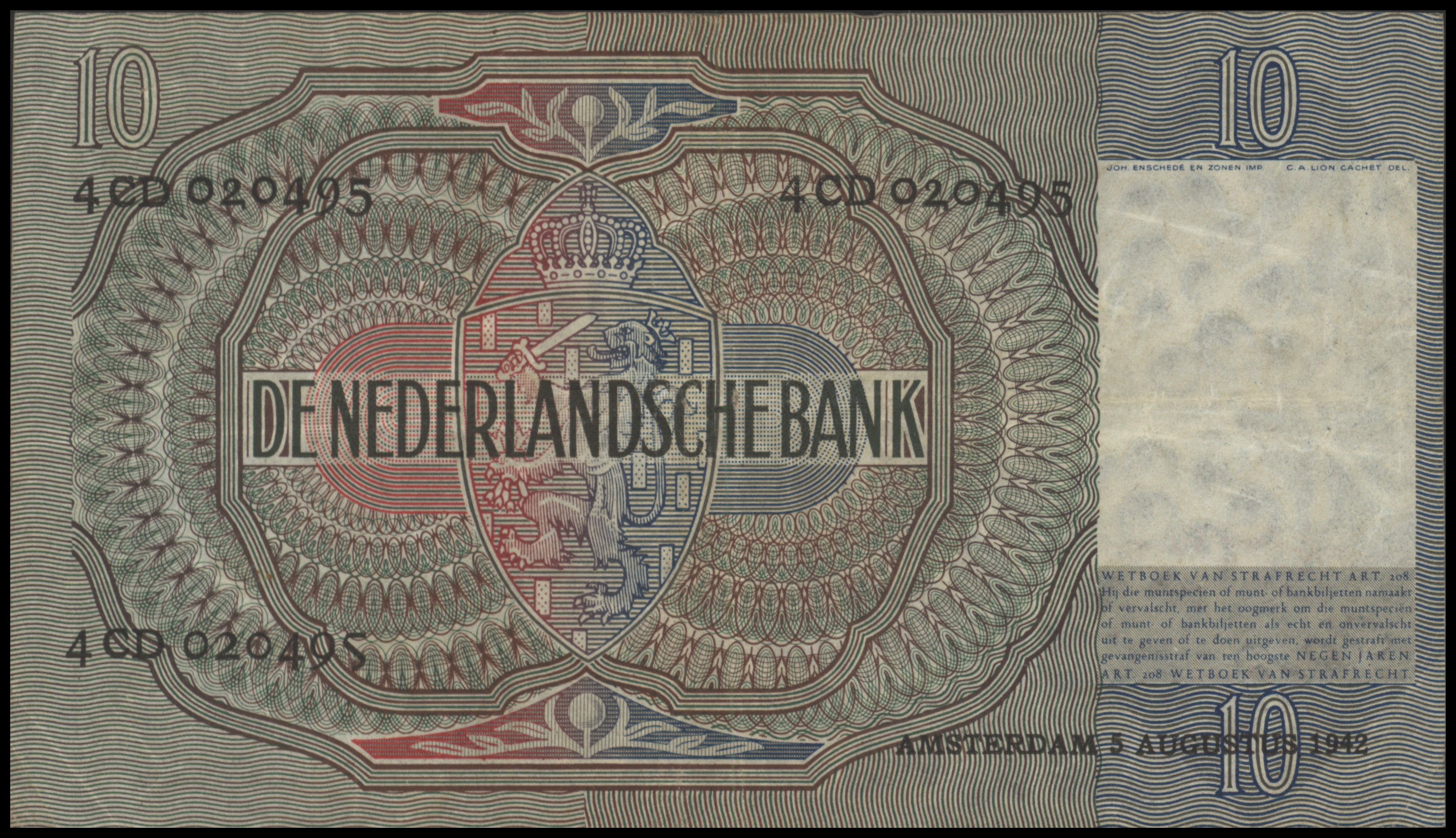 Netherlands PL38.b 10 Gulden 1942