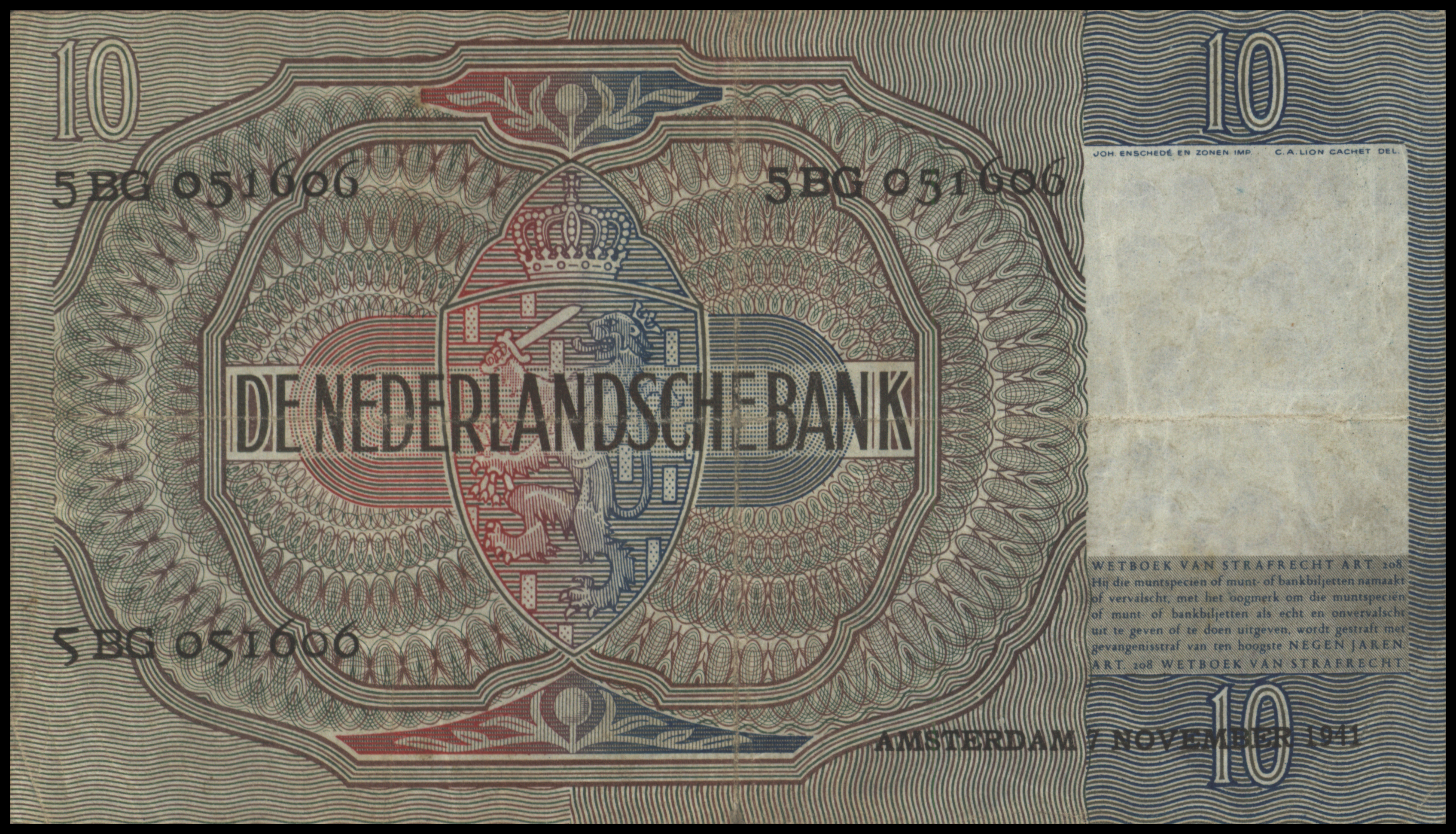 Netherlands PL38.b 10 Gulden 1941
