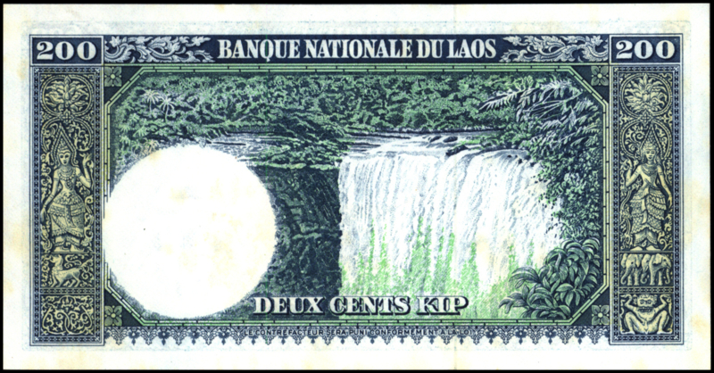 | Remarks: | Minor foxing Blue on green and multiolor. King Vatthana; Wat that Luang stupa; palm trees. Rev: Waterfalls. Solid secu thread. Wmk: Erawa three-headed elephant. |