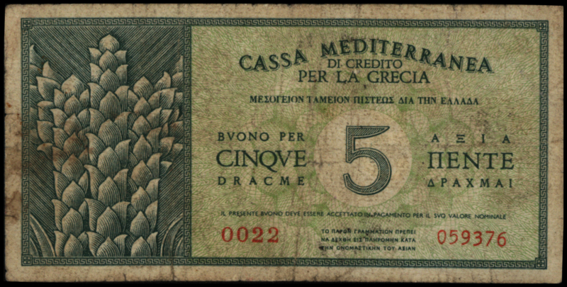 | Remarks: | Italian Mediterranean Bank of Credit for Greece. No date. No signs. Series 0001-0022 1941 Occupation issues |