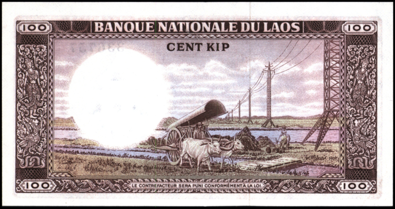 | Remarks: | Brown. King Vatthana; temple. Rev. Man in ox cart; river; child riding water buffalo; electrical power towers. Solid secu thread. Wmk: Three headed elephant.. |