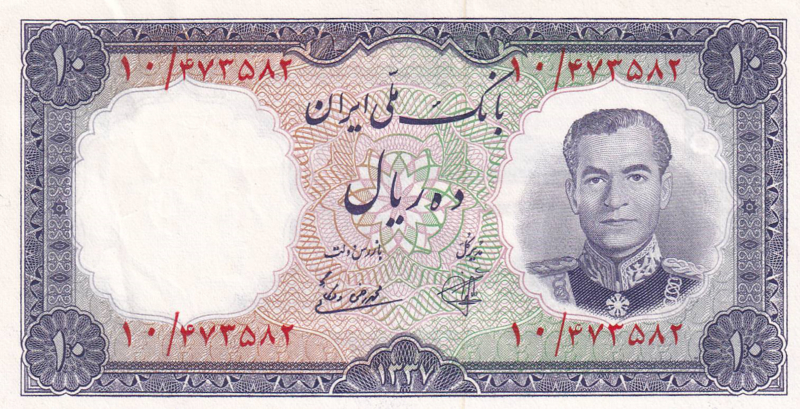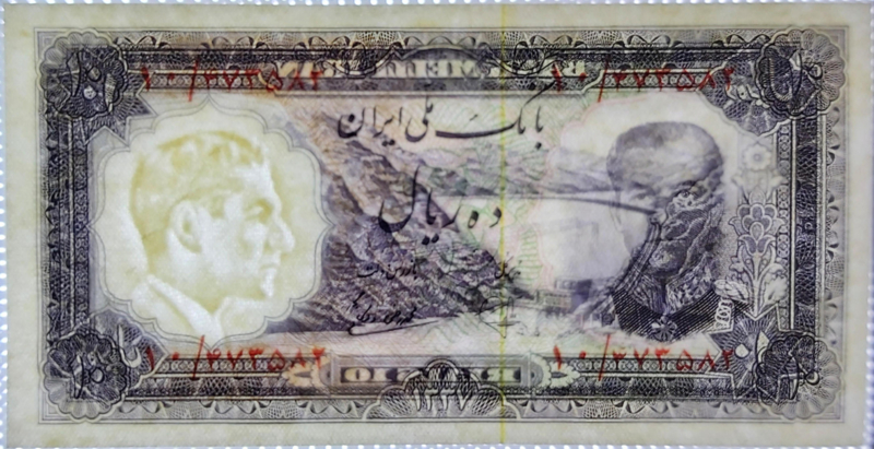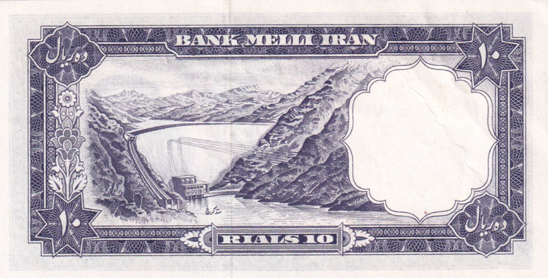 | Remarks: | Signs Vishkai, Kashani. Blue, orange and green. Obv. Farsi text; M.R>Shah Pahlavi. Rev. English and Farsi text; Amir Kabir dam in Karaj. Solid yellow secu thread. Wmk: Shah Pahlavi. |