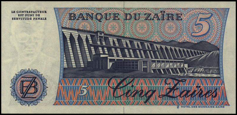 | Remarks: | Sign Syakassighe. Printer: HOTEL DES MONNAIES-ZAÏRE Blue, black and multicolor. Mobutu in civilian dress at center right, leopard at lower left facing left. Back: hydroelectric dam at center right. Watermark: Mobutu in civilian dress. |