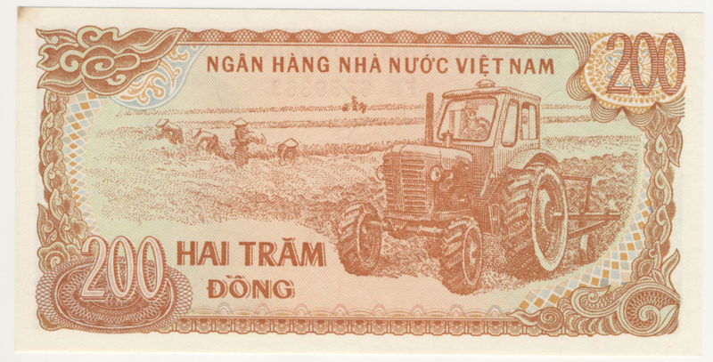 | Remarks: | CỘNG HÒA XÃ HỘI CHỦ NGHῖA VIÊT NAM. Series widely spaced. Brown, orange and light blue. Front: Coat of arms; Ho Chi Minh. Back Workers in field with tractor. No secu thread. Wmk: Flower pattern. |