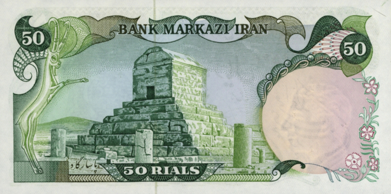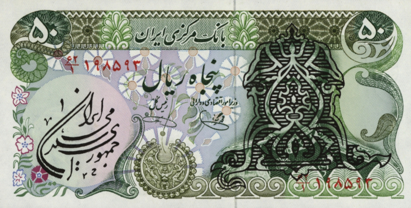 | Remarks: | No date. Signs Kish and Yeganeh. Black overprint.on P101.e Green. Front: Farsi tekst; flowers; calligraphic overprint; metal artifact with animals; Mohammad Reza Shah Pahlavi with overprint B. Back: English and Farsi tekst; rearing animal; Tomb of Cyrus the Great in Pasargadae; flowers. Solid yellow security thread. Watermark: Mohammad Reza Shah Pahlavi. |