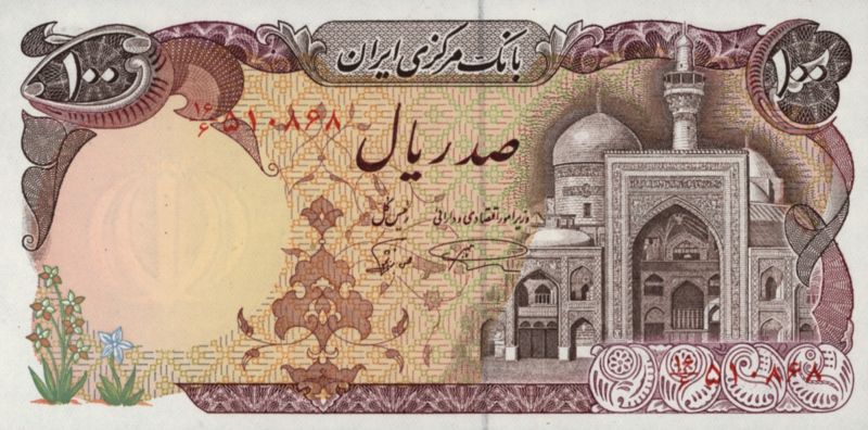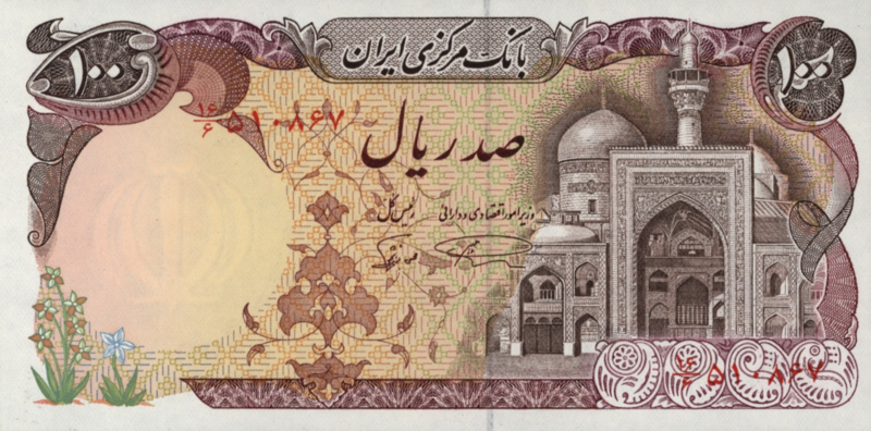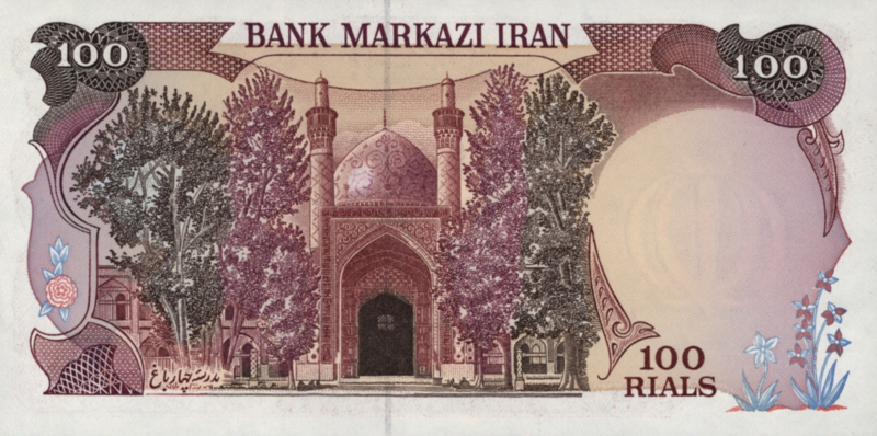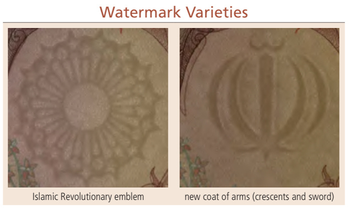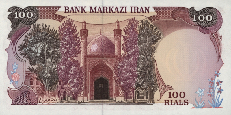 Maroon and light brown. Obv: Farsi text; flowers; Imam Reza shrine in Mashhad. Rev. English and Farsi text'flowers;trees;madressa Chaharbagh school in Isfahan. Solid secu thread with printed Farsi script)