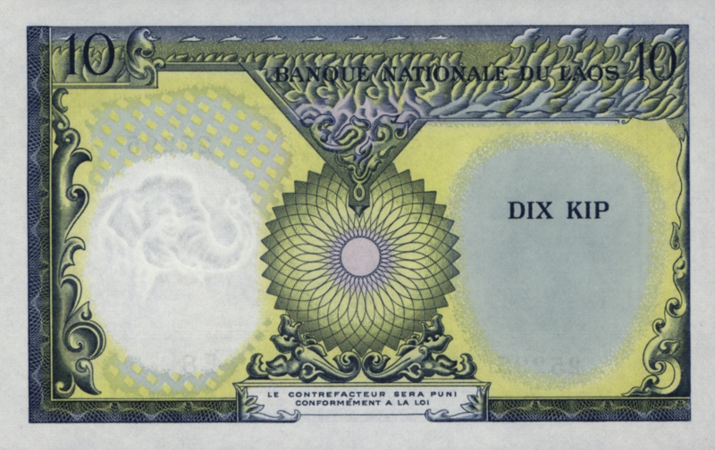 | Remarks: | Blue and yellow. Obv.: Lao text; costumed Lao woman. Rev.: French text; stylized sunburst. No secu thread. Wmk: Elephant head. |