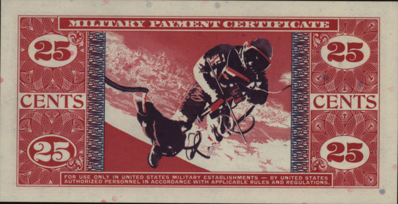 | Remarks: | Military Payment Certificate. Series 681 Red and blue. Front: English tekst; United States Navy Ethan Allen class nuclear-powered submarine Thomas Edison on ocean surface with crew members on deck. Back: English tekst; Major Edward White making a space walk during Gemini 4 space flight.. |