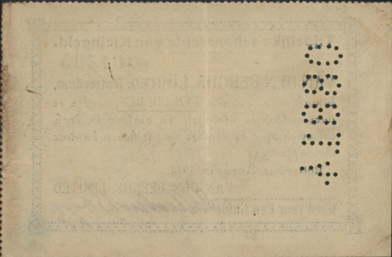 | Remarks: | Particulier noodgeld WO-I. Geperforeerd "08814" Links. Exemplaar linksonder uit vel. Van den Berghs, Limited, Rotterdam |
