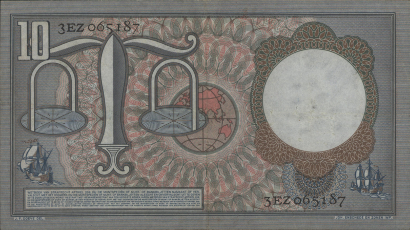 | Remarks: | Bankbiljet. 1 cijfer 2 letters 6 cijfers. Wmk. Vertical row of 10's. Bolten 14.2.d Serie 1/6 DH - 1/6 JM op 80 grams papier met vernis. Rode hoofdkleur vz. |