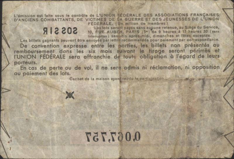 | Remarks: | 4e tranche 1940. 11 Francs. L'union fedérale d associations Françaises d'anciens combattants, de victimes de la guerre et des jeunesses de l'union federale. |