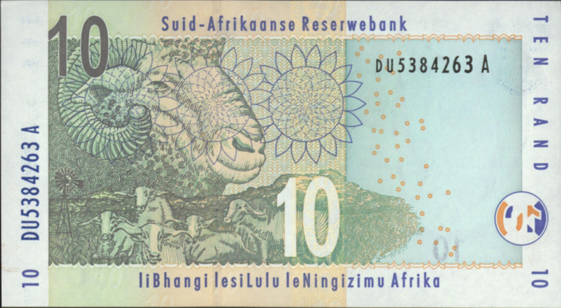 | Remarks: | Sign Mboweni Green on multicolor underprint. White rhinoceros at center. Large white rhino head at right, coat of arms at top left, varkous geometric shpes at lower portion. Back: Ram's head over sheep at left. Wmk: Rhino head. |