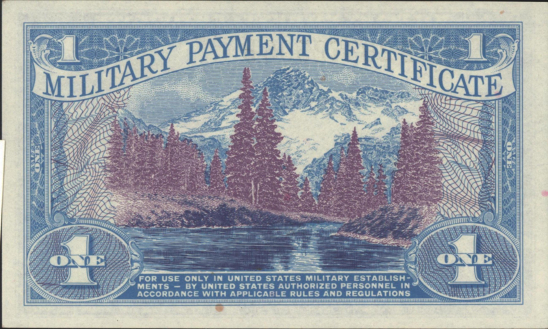 | Remarks: | Military Payment Certificate. Series 661 Blue and purple. Front: English tekst; allegorical woman. Back: English tekst; pine trees and lake with Mount Rainer in background. |