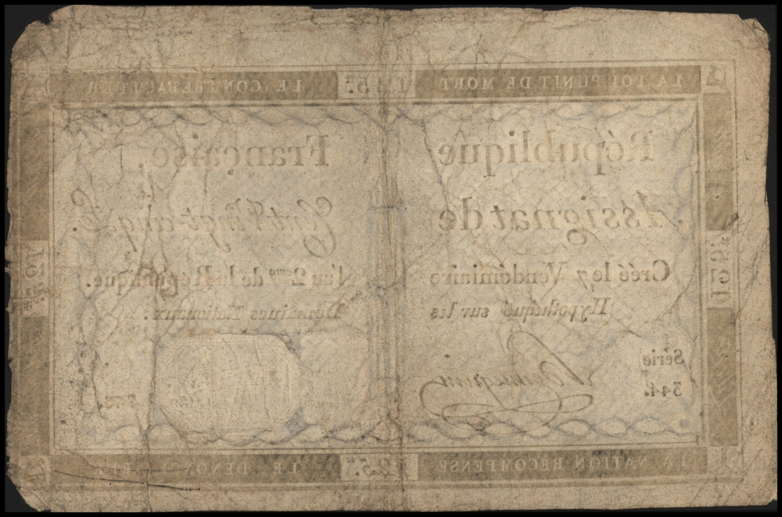 | Remarks: | Domaines Nationaux. Wit papier. Serieletters en individuele -nummers gedrukt. Emission 28.09.1793 (7 vendemiaire an II) |
