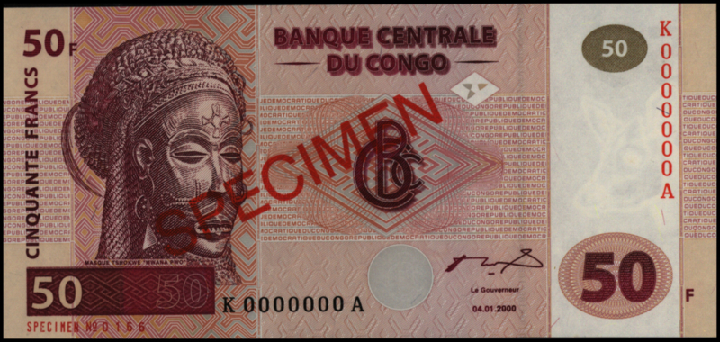 Congo Democratic Republic (Kinshasa) P91 50 Francs 2000 SPECIMENCongo Democratische Republiek (Kinshasa) / Congo Democratic Republic (Kinshasa), 50 Francs. Type jaar/year: [2000-01-04]